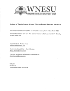 The Town of Westminster has an opening for an Emergency Management Director. The EMD is appointed by the Selectboard and manages the local emergency management organization, creates and maintains the Local Emergency Management Plan (LEMP), and facilitates meetings with local stakeholders. Currently unfunded, a modest stipend will be available for FY2026. Applications should be returned to the Town Manager either by mail at: PO Box 147, Westminster, VT 05158 or by email: manager@westminstervt.org. Click here for the job application. Click here for the job description.
